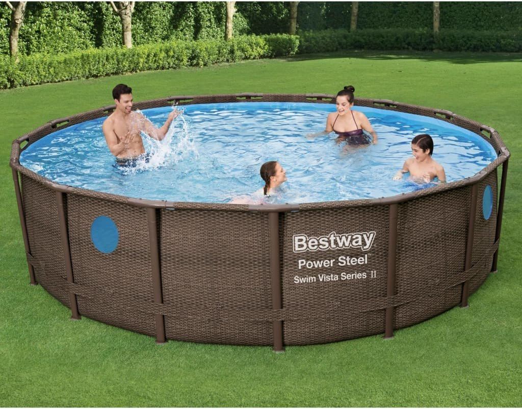 У цьому басейні Bestway Power Steel ви отримаєте масу задоволення з сім'єю і друзями, адже його кругла форма забезпечує більшу площу поверхні для плавання і ігор. Цей наземний басейн поєднує в собі міцність і стиль, а принт, що нагадує ротанг, додасть нотку розкоші вашому саду або задньому двору.