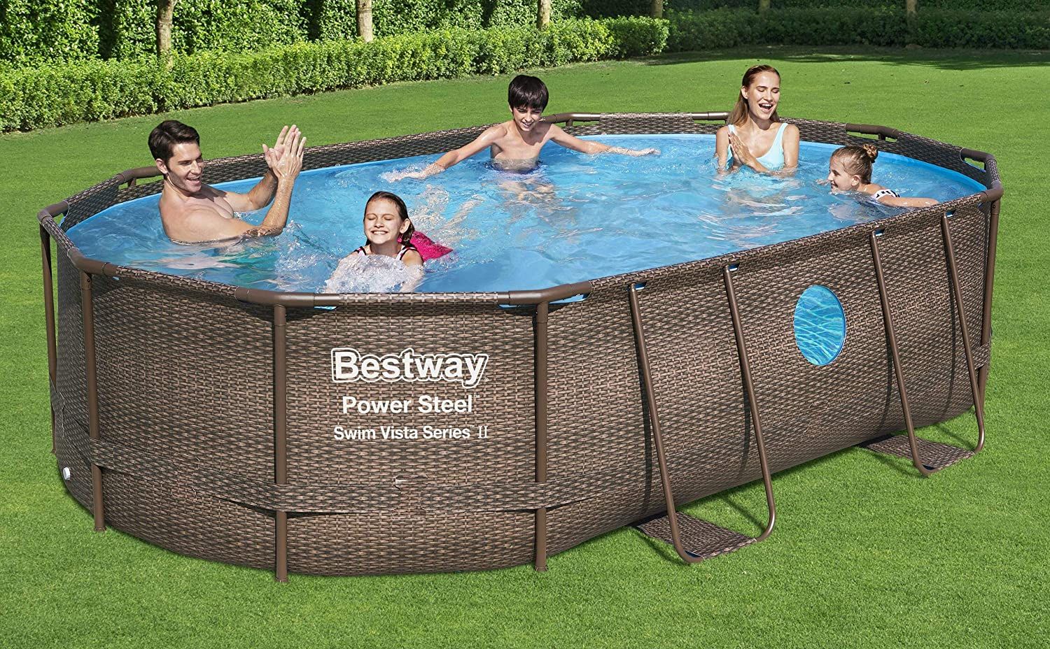 Ви отримаєте масу задоволення з сім'єю і друзями в цьому басейні Bestway Power Steel, овальна форма якого забезпечує більшу площу поверхні для плавання і ігор. Цей наземний басейн поєднує в собі міцність і стиль, а принт, що нагадує ротанг, додасть нотку розкоші вашому саду або задньому двору.