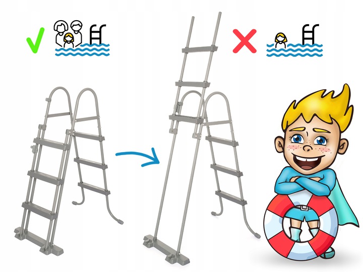 Сходи полегшують безпечний вхід і вихід з басейну. Сходинки з одного боку можна підняти вгору, щоб маленькі діти не могли піднятися по сходах і потрапити в басейн. Басейн можна легко скласти для транспортування і зберігання, коли він не використовується.