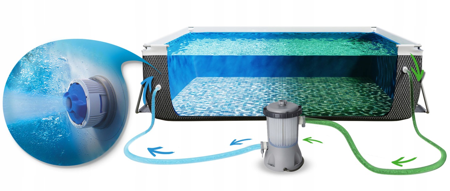 Електричний фільтрувальний насос є частиною циркуляційної системи, що забезпечує чистоту води. Антимікробний фільтрувальний картридж запобігає росту водоростей, цвілі і бактерій в басейні. Дозатор ChemConnect підтримує чистоту і здоров'я води.