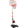 Баскетбольний набір має регульовану підставку, тому ви можете легко відрегулювати висоту іграшки під потреби дитини. Набір можна регулювати від приблизно 97 см до 170 см. Збірка набору дуже проста і займає всього кілька хвилин. Баскетбольний набір зі щитом включає велику і міцну основу, яку можна додатково завантажувати водою або піском для більшої стійкості. Іграшка оснащена світловими і звуковими ефектами, які ефективно залучають і заохочують дітей до гри в баскетбол. Веселі мелодії та звуки оплесків, що супроводжують гру, спонукають дитину до гри, завдяки чому вона стає все кращою у грі. Додатково на електронному табло відображається результат точності кидка. За кожен вдалий кидок малюк отримує 2 бали, через 50 секунд мелодія прискорюється, а потім вдалі кидки отримують 3 бали. Це, безсумнівно, мотивуючий фактор для юного любителя спорту, і він отримає масу радості від встановлення нових рекордів. Барвиста упаковка у вигляді валізи робить набір ідеальним подарунком для хлопчиків і дівчаток