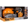Після натискання та утримання нижньої кнопки на рукоятці пили ланцюг почне динамічно обертатися , видаючи реалістичні звуки різання . Крім того, під час роботи загоряється світлодіод на передній частині пилки , додаючи грі ще більше реалістичності. У набір також входить регульований захисний шолом з лампою та ремінцем для підборіддя , тому ваша дитина почуватиметься справжнім любителем саморобки.