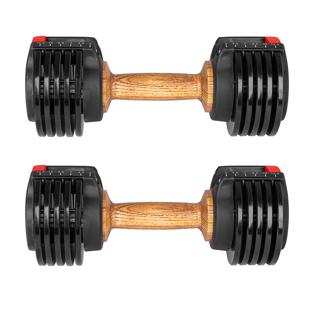 Ви також можете оцінити витончену на вигляд дерев’яну ручку та пластикову підставку, достатньо велику, щоб вмістити обидві гантелі. Таким чином, вам не доведеться турбуватися про те, що гантелі відкочуються, коли ви кладете їх на підлогу. Якщо ви шукаєте простий у використанні та економію місця набір гантелей, виберіть регульований набір гантелей однією рукою inSPORTline IRONER 15!