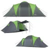 Конструкція намету складається з чотирьох каркасів зі склопластику, які вбудовані в тропіки. Тунелі та рами позначені однаковим кольором, тому ви можете легко підібрати відповідну раму до тунелю. Завдяки спеціальним рукояткам всередині фальшкорпуса встановлені дві незалежні спальні. Весь намет, включаючи смуги, що прикріплюють лист, кріпляться на шпильках.