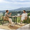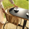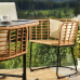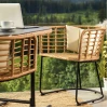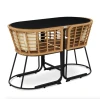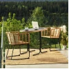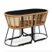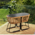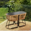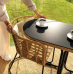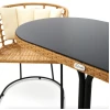 Овальний стіл забезпечує достатньо місця, щоб подати страви, закуски та напої під час відпочинку на свіжому повітрі. Стільниця виготовлена із загартованого скла з сатиновою поверхнею глибокого чорного відтінку, воно міцне, водостійке та легко чиститься. Краї стільниці окантовані тасьмою з техноротангу контрастного бежевого кольору. Повторюваний мотив коси надає меблям характерний стиль, який поєднує всі елементи гарнітура в гармонійне ціле.