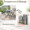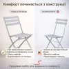Усі елементи виготовлені зі сталі та покриті порошковою фарбою, що забезпечує стійкість до вологи, сонця та щоденного використання. Складний механізм дозволяє швидко скласти стіл і стільці, звільнивши простір або прибравши комплект на зберігання поза сезоном.