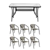 Шість крісел з плетеного штучного ротанга мають зручну ергономічну форму з підлокітниками, а металевий каркас забезпечує стабільність і довгий термін служби. Набір чудово підходить як для сімейних обідів, так і для прийому гостей.