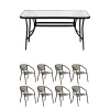 Вісім крісел з плетеного штучного ротанга мають зручну ергономічну форму з підлокітниками, а металевий каркас забезпечує стабільність і довгий термін служби. Набір чудово підходить як для сімейних обідів, так і для прийому гостей.