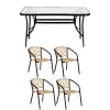 Чотири крісла з плетеного штучного ротанга мають зручну ергономічну форму з підлокітниками, а металевий каркас забезпечує стабільність і довгий термін служби. Набір чудово підходить як для сімейних обідів, так і для прийому гостей.