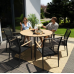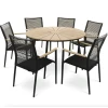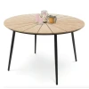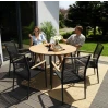 Функціональний великий садовий стіл із круглою стільницею забезпечує достатньо місця для шести осіб. Міцна, але легка алюмінієва конструкція з тонкими ніжками та міцною стільницею з поліетилену гарантують стійкість столу до корозії та шкідливого впливу атмосферних факторів, завдяки чому меблі зберігають свою естетичність протягом багатьох років використання. Стільниця виготовлена з концентрично складених панелей поліуретанового дерева, які точно імітують структуру та зовнішній вигляд натуральної деревини , але на відміну від неї не потребують сезонного догляду та легко утримуються в чистоті, оскільки її поверхня не вбирає бруд. Ніжки столу оснащені практичним регулюванням висоти, що дозволяє стійко розташовувати стіл і точно вирівнювати його на нерівних поверхнях.