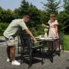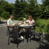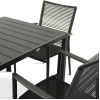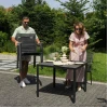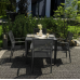 Практичний квадратний стіл для саду стійкий до корозії та мінливих погодних умов завдяки використанню міцних матеріалів. Чорна алюмінієва рама міцна і стійка, і в той же час легка, тому стіл можна легко переміщати. Стільниця з полівуду сірого кольору ідеально імітує зовнішній вигляд деревини, але на відміну від натуральної сировини не потребує догляду, легко миється та стійка до вологи, тому випадково пролиті напої не залишать на ній плям. Крім того, стіл оснащений регульованими ніжками, які дозволяють вирівнювати нерівності підлоги, які часто виникають у саду, що дозволяє столу бути стійким у будь-яких умовах.