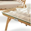 Маленький журнальний столик ідеально поєднується з двома кріслами, становлячи функціональне доповнення набору. У ньому вдало розмістяться чашки з кавою і тортова тарілка, а також буде місце для дрібниць, наприклад, книги або телефону. Конструкцію зі сталі та техноротанга доповнює стільниця із загартованого скла. Скло товщиною 5 мм міцне, стійке до подряпин і його легко чистити.
