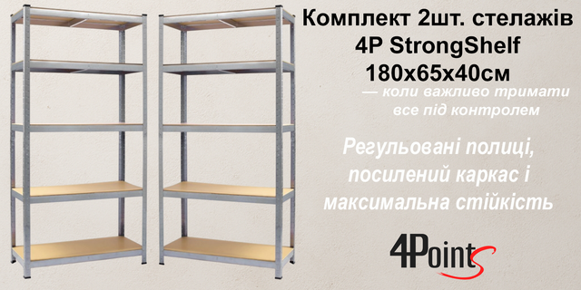 Опис Комплект стелажів 2шт. 4Р StrongShelf 180х65х40см оцинкований 5 полиць МДФ загальне навантаження до 875 кг для складу комори гараж