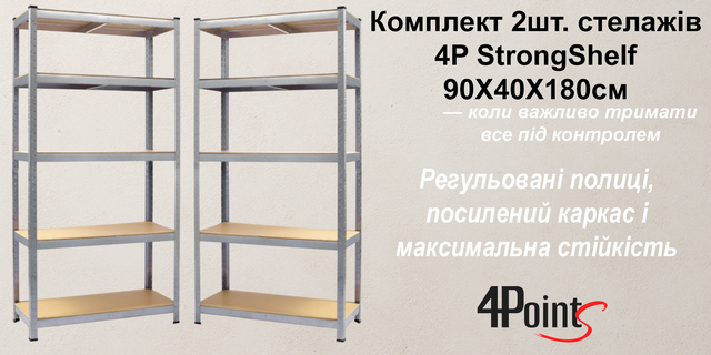 Комплект стелажів 2шт. 4Р StrongShelf 180х90х40см оцинкований 5 полиць МДФ загальне навантаження до 875 кг для складу комори гараж