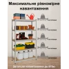 Каркас виконаний з міцної оцинкованої сталі товщиною 0,6 мм , яка не схильна до корозії навіть у вологих приміщеннях. Полиці виготовлені з МДФ товщиною 4 мм , стійкого до навантажень та деформацій. Висота полиць регулюється кроком 40 мм, що дозволяє легко адаптувати простір під різні типи предметів.