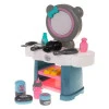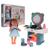 Туалетний столик оснащений дзеркалом з підсвічуванням і звуковими ефектами у вигляді мелодій , що створює неповторну атмосферу під час гри. У ляльки м'яке личко, рухливі ручки та ноги , а волосся ідеально підходить для розчісування. У набір входять різноманітні аксесуари для догляду та укладання - мильниця, ємності для мазі та пудри, флакони для духів, щітка, гребінець, дзеркало та фен.