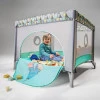 Функціональні боки для забезпечення адекватної циркуляції повітря та огляду дитини Бічний вхід на блискавці Барвисті принти Конструкція захищена від випадкового складання. Цей розчин особливо важливий, коли малюк стоїть або стрибає в манеж. 2 колеса з гальмом для легкого пересування У комплекті сумка