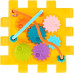 На зеленій стіні встановлено інтерактивне міні-піаніно зі звуками до-ре-мі-фа та звуками скрипки та саксофона. Фіолетовий пазл - це імітація кабіни автомобіля з великим кермом з клаксоном. На жовтій стіні є 2 сенсорні петлі з переплетеними намистинами та загалом 6 шестерень, які приводять одна одну в рух.