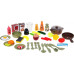 Кухня,дошка для записів,гумка для дошки,крейда для дошки,каструля з кришкою,сковорода,миска,три тарілки,кухоль,плече,ківш,дві чайні ложки,два ножі,вилка маленька ложка цукру,кондитер,солонка,заклинатель,гірчиця,молоко,сік,печиво,кетчуп,карамбола,помідор,боби,капуста,лист салату,кружечок моркви,банан,перець,огірок,креветка,сосиски,смажене яйце.