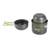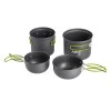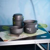Посуд виготовлений з міцного, стійкого до пошкоджень анодованого алюмінію. Вони дуже міцні та легкі. І каструлі, і миски спроектовані таким чином, щоб легко входили одна в одну, що ще більше полегшує їхнє пакування та транспортування. Ідеальне рішення для тих, хто хоче насолодитися красою приготування їжі на природі без компромісів. Крім того, набір має складні ручки, покриті ізоляцією, щоб запобігти випадковим опікам під час перенесення посуду з конфорки. До набору також входить практична сумка для столового набору.