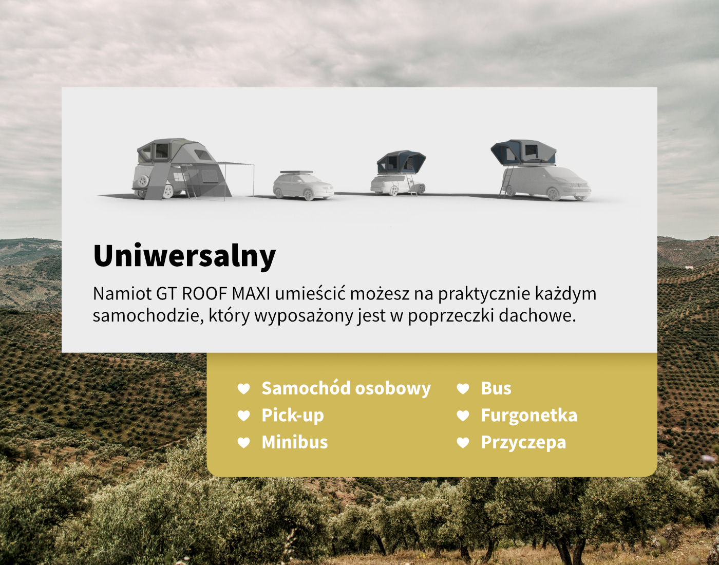 Палатка ROOF MAXI от GentleTent – идеальный выбор для семьи или пары, которые ценят комфорт во время кемпинга и требуют больше места. Установите его на свой автомобиль и будьте полностью независимы. Подарите семье удивительные приключения и воспоминания на долгие годы. Найдите место с великолепным видом и наблюдайте за ним утром через одно из многочисленных окон в палатке, держа в руке чашку горячего кофе. Это звучит заманчиво? Мы уверены, что да!