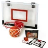Вы любите командные игры? Мечтаешь стать звездой НБА? Тренируйтесь баскетболом даже дома. Набор включает в себя большую доску, висящую на дверях, насосом и мячом. Доска была разработана таким образом, чтобы она не производила шума во время игры, имеет специальные дверные ручки и плотную пену, которая предотвращает ее скольжение и удары о дверь. В набор входит баскетбольный мяч и насос.