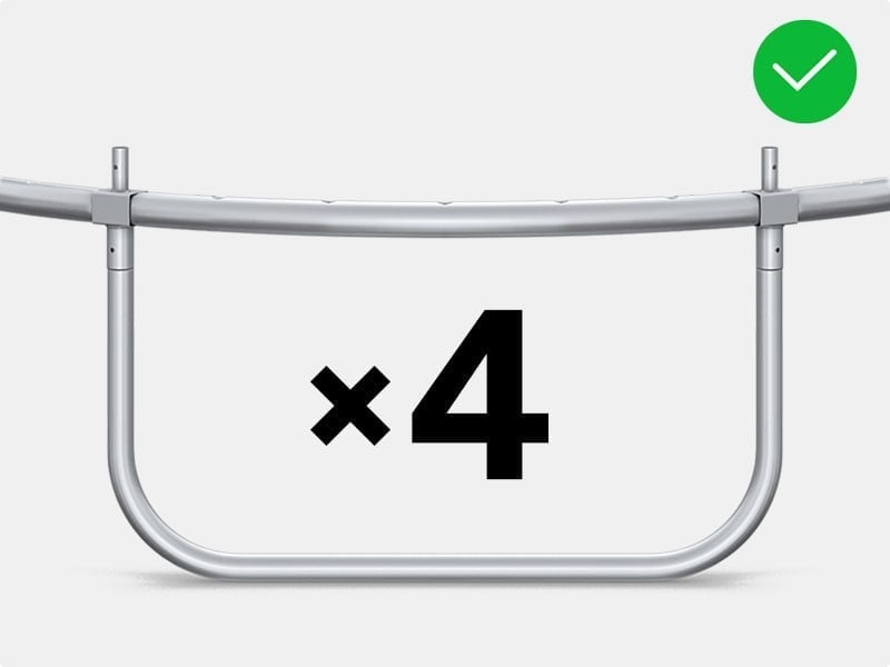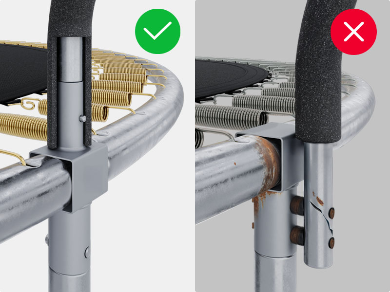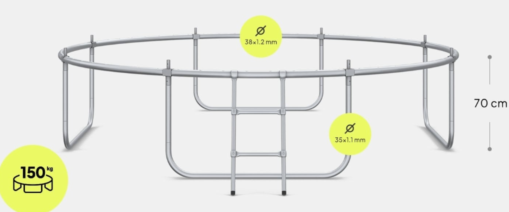 Каркас батута сделан из оцинкованной стали для защиты элементов от погодных условий. Трубы рамы имеют диаметр 38 мм и толщину стенки 1,2 мм.