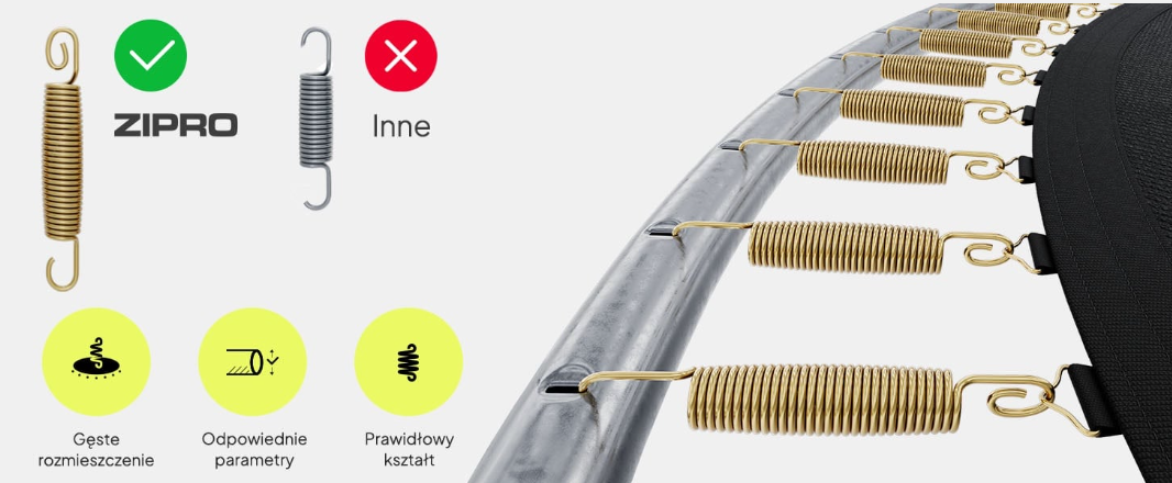Батут ZIPRO JumpPro построен с использованием 56 плотно скрученных пружин длиной 145 мм, изготовленных из проволоки толщиной 3,1 мм. Правильное количество и расположение обеспечивает сильный отскок и очень хорошую амортизацию во время приземления.