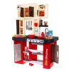 Столешница кухонного гарнитура велика и на ней легко разместятся разные продукты. В его правой части находятся самые большие аттракционы набора. Это, конечно, мойка с краном, из которого льется настоящая вода , а также плита с интерактивными конфорками . Дети смогут мыть руки и муляжи овощей и фруктов в раковине.