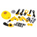 В набор из 23 деталей входят игрушечный молоток, пила, отвертка, гаечные ключи и плоскогубцы. Кроме того, есть такие аксессуары, как винты, гайки, шестерни, угольник и штангенциркуль. Разместив все детали на подставке, малыши смогут вращать шестерни, которые соединены между собой и приводят друг друга в движение.