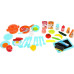 Интересная достопримечательность набора – дощечка с мелом и резинкой. Дети могут записать свои любимые рецепты или список покупок. Внизу под столешницей находится бутафорский холодильник с открывающейся дверцей. В ней, как и на многих полках, можно расставлять фиктивные продукты питания, которых в наборе очень много.