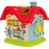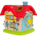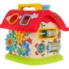 Дом имеет несколько разных стен, каждая из которых предлагает разные возможности для игры. На одной из них есть часы, которые при правильном подборе подсказок открывают скрытую дверь. Другая стена оборудована сортером букв, где ребенок подбирает блоки с буквами A, B, C и D. Малыш также может играть с зубчатыми колесами, вращающимися при повороте рукоятки, а также со счетом с цветными шариками, цилиндром и шариком со звуковыми бусинами, что обеспечивает богатую сенсорную стимуляцию.