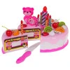 Щедро украшен розовый праздничный набор для детей от 3 лет. Он состоит из 80 деталей, включая торт, который можно украсить, а также различные аксессуары, такие как свечи, фрукты и другие кондитерские изделия.