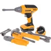 В набор входит интерактивная дрель-шуруповерт, работающая от батареек и воспроизводящая функции настоящего инструмента. Шуруповерт позволяет завинчивать и выкручивать винты, издает реалистичные звуки, подсвечивается во время работы, имеет сменную батарею и разнообразные насадки, которые можно легко заменить. Этот элемент игрушки максимально увлекает детей, обеспечивая им интерактивную игру, развивающую мануальные навыки.