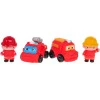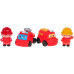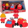 Набор пожарных с машинками изготовлен из безопасных материалов в ярких цветах, чтобы привлечь малышей. Фигурка пожарного в желтом шлеме и автомобили имеют погремушки внутри, что дополнительно обогащает игру звуковыми элементами. Вращающиеся головы фигурок пожарных придают интерактивности, а резиновые машинки удобно держать маленькими ручонками.