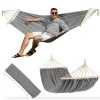 Двухместный гамак Lecco имеет просторную конструкцию - 290см в длину и 150см в ширину, что позволяет комфортно разместиться одному или даже двум лицам. Свободная драпировка ткани мягко окутывает тело, обеспечивая полную релаксацию, а не слишком тугое натяжение создает эффект естественного объятия. Материал гамака – это сбалансированное сочетание 65% полиэстера и 35% хлопка. Такая композиция обеспечивает одновременно мягкость и прочность: хлопок дарит комфорт, а полиэстер придает эластичность, быстрое высыхание и устойчивость к деформациям. Ткань не только приятна к телу, но и долговечна, что делает гамак практичным в повседневном использовании.
