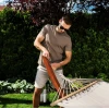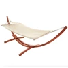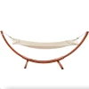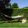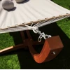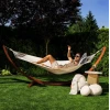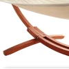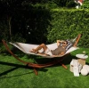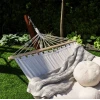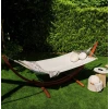 Полотно гамака для сада изготовлено из ткани, состоящей из 65% хлопка и 35% полиэстера – сочетания, гарантирующего мягкость, воздухопроницаемость и долговечность. Материал не вызывает раздражения, приятен на ощупь и обеспечивает максимальный комфорт даже во время длительного лежания. Натяжение полотна равномерно распределено благодаря деревянной распорке, что предотвращает замятие и смещение ткани.