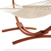 Каркас изготовлен из натуральной лиственницы, известной своей стойкостью к влаге, механическим нагрузкам и времени. Промасленное покрытие с тиковым эффектом не только защищает древесину, но и подчеркивает ее теплый, насыщенный цвет. Благодаря толстому профилю 6×6см гамак для дачи отличается стабильностью и надежностью, а изящная изогнутая форма придает конструкции элегантности.
