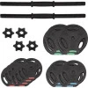 В набор входят 2 штанги, 4 звездочки, 16 пластин: 8x1,25 кг, 4x2,5 кг, 4x5 кг.