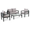 Садовая мебель Brescia 2 от Di Volio – это гарантия высокого качества и хорошего отдыха в теплые летние дни. Элегантный, минималистичный дизайн мебели идеально подходит практически к любому оформлению сада или террасы. Комплект изготовлен из устойчивого к атмосферным воздействиям, прочного алюминиевого каркаса с порошковым покрытием, гарантирующего долговечность мебели на протяжении многих лет. Набор состоит из двух удобных кресел, двухместного дивана и журнального столика с элегантной столешницей из молочного стекла. И кресла, и диван укомплектованы мягкими подушками серого цвета с пропиткой.