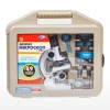 - Комплектация : микроскоп, слайды и этикетки, защитное стекло, лупа, пробирки, пипетки, другие аксессуары, банк данных Advanced Optics, кейс для хранения