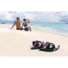 Маска имеет поликарбонатные линзы с UV-покрытием, что гарантирует защиту глаз от солнца и прочность. Она плотно прилегает к лицу, предотвращая попадание воды, а регулируемый силиконовый ремешок позволяет подстроить ее под разные размеры головы. Трубка оснащена мягким силиконовым мундштуком и специальной накладкой, которая предотвращает проникновение воды внутрь.