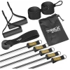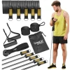 - В набор входят резинки: 4,6 кг, 9 кг, 13,6 кг, 18,2 кг, 22,8 кг, 2 эргономичные ручки, 2 ремешка на лодыжке, 1 дверной фиксатор, сумка для хранения.