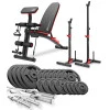 В комплект входят 18 высококлассных чугунных дисков общим весом 85кг, прямой гриф длиной 167см, изогнутый гриф длиной 120см и два гантельных грифа из хромированной стали.
