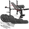 Конструкция тренировочной скамьи с фиксатором для ног и партой Скотта позволяет выполнять самые разные упражнения. Поддержка правильной осанки во время упражнений делает тренировки эффективными и безопасными. Скамейку легко подогнать под свои параметры с помощью простых регулировок. В комплект входят 16 высококлассных чугунных дисков общим весом 85кг, прямой гриф длиной 167см, изогнутый гриф длиной 120см и два гантельных грифа из хромированной стали.