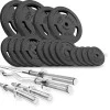 Конструкция тренировочной скамьи с партой Скотта позволяет выполнять самые разные упражнения. Поддержка правильной осанки во время упражнений делает тренировки эффективными и безопасными. Скамейку легко подогнать под свои параметры с помощью простых регулировок. В комплект входят 16 высококлассных чугунных дисков общим весом 85кг, прямой гриф длиной 167см, изогнутый гриф длиной 120см и два гантельных грифа из хромированной стали.