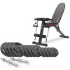 Конструкция тренировочной скамейки с фиксатором для ног позволяет выполнять самые разнообразные упражнения. Поддержка правильной осанки во время упражнений делает тренировки эффективными и безопасными. Скамейку легко подогнать под свои параметры с помощью простых регулировок. В комплект входят 12 высококлассных чугунных диска общим весом 35кг и два грифа длиной 40см из хромированной стали.