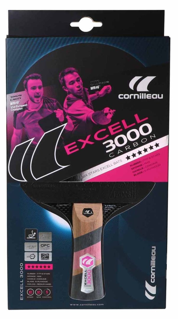 EXCELL CARBON 3000 – новая ракетка для настольного тенниса от известного французского бренда Cornilleau. Используемые технологии AERO SOFT и OFC обеспечивают отличный контакт и контроль над мячом, а накладка с технологией EFFICIENT CURVE гарантирует отличное вращение топпсина. Накладка DYNECELL и высокодинамическое основание ракетки делают ее идеальным оборудованием для обычной игры, особенно для игроков OFF+. Конструкция основания и толщина резины гарантируют постоянную траекторию и вращение при каждом ударе. Использование CARBON TECHNOLOGY, то есть специальной вставки из 100% углеродного волокна, размещённой в ручке и голове ракетки, повышает жесткость ракетки.