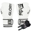 Модель оснащена ремешком на липучке для надежной фиксации запястья и фиксатором большого пальца, который позволяет правильно сжимать кулак и обеспечивает максимальную защиту во время спаррингов и тренировок. Уникальные принты GLORY на одной перчатке и Fairtex на другой подчеркивают эксклюзивность этой модели.