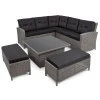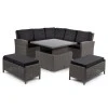 Мебель Di Volio Festa – это комплексный обеденный и развлекательный набор, который можно разместить в саду или на террасе. Благодаря ему можно устроить место для застолья и отдыха с семьей и друзьями. Комплект Festa состоит из уголка со спинкой, двух пуфов и стола с регулируемой высотой. Мебель сделана из ротанга – качественное плетение придает ей элегантный и стильный вид, а стальная конструкция, на которой она установлена, гарантирует прочность и надежность. В комплект также входят подушки с чехлами. Они изготовлены из плотной ткани, устойчивой к влаге и грязи.